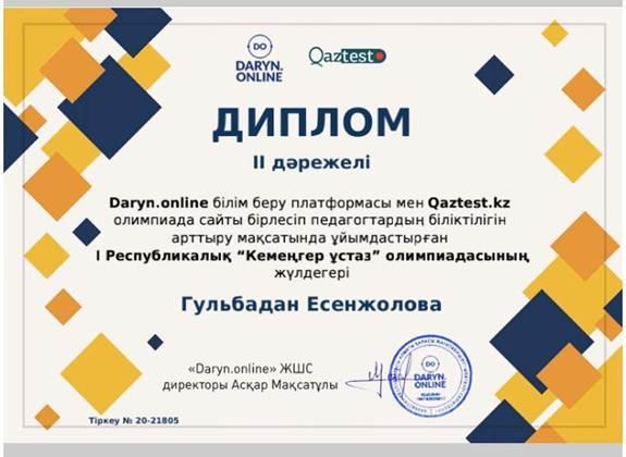 Darun.online білім беру платформасы мен Oaztest.kz олимпиада сайты бірлесіп педагогтардың біліктілігін арттыру мақсатында ұйымдастырған I Республикалық “Кемеңгер ұстаз” олимпиадасына бастауыш сынып мұғалімі Есенжолова Г.Ш.қатысып, II дәрежелі дипломмен марапатталды.